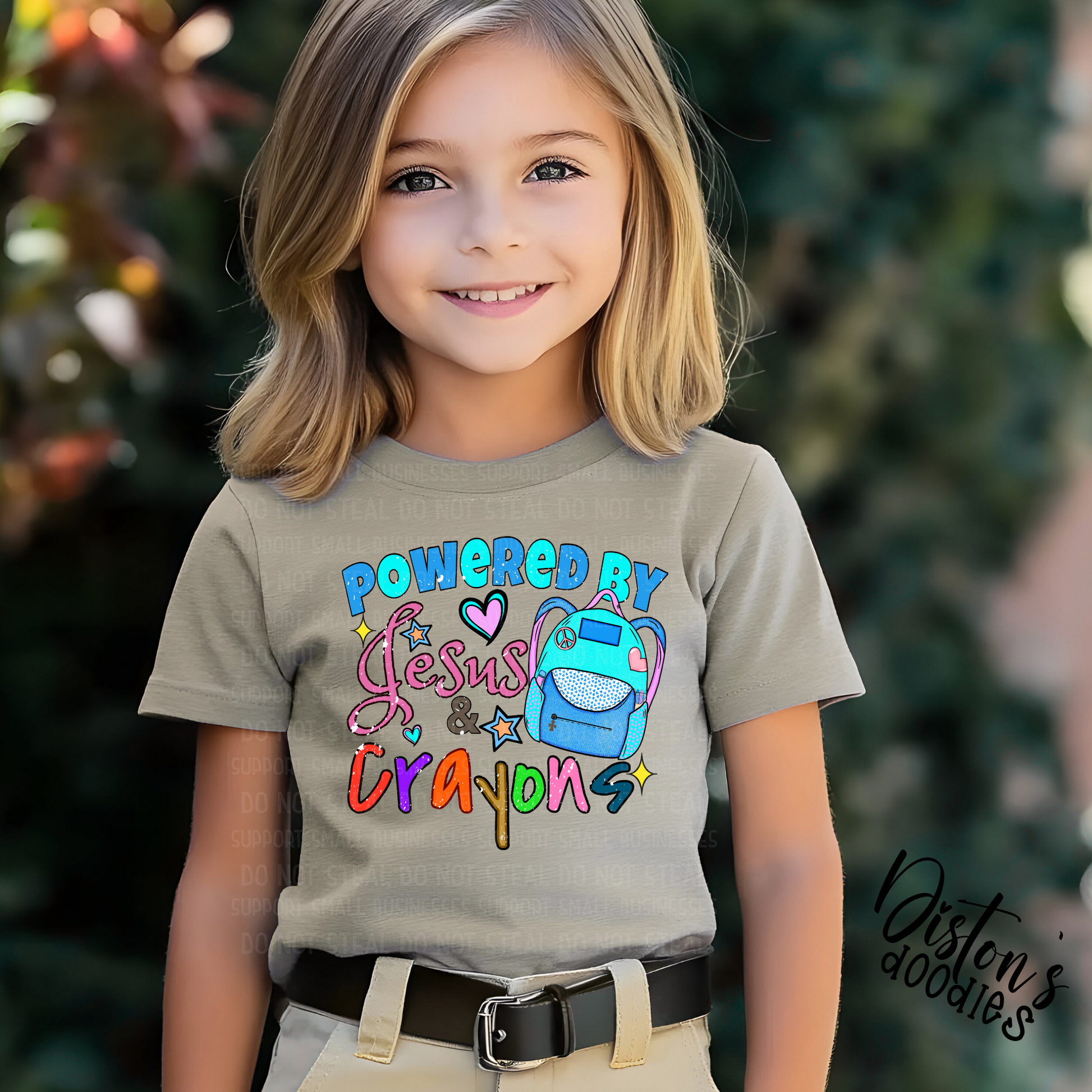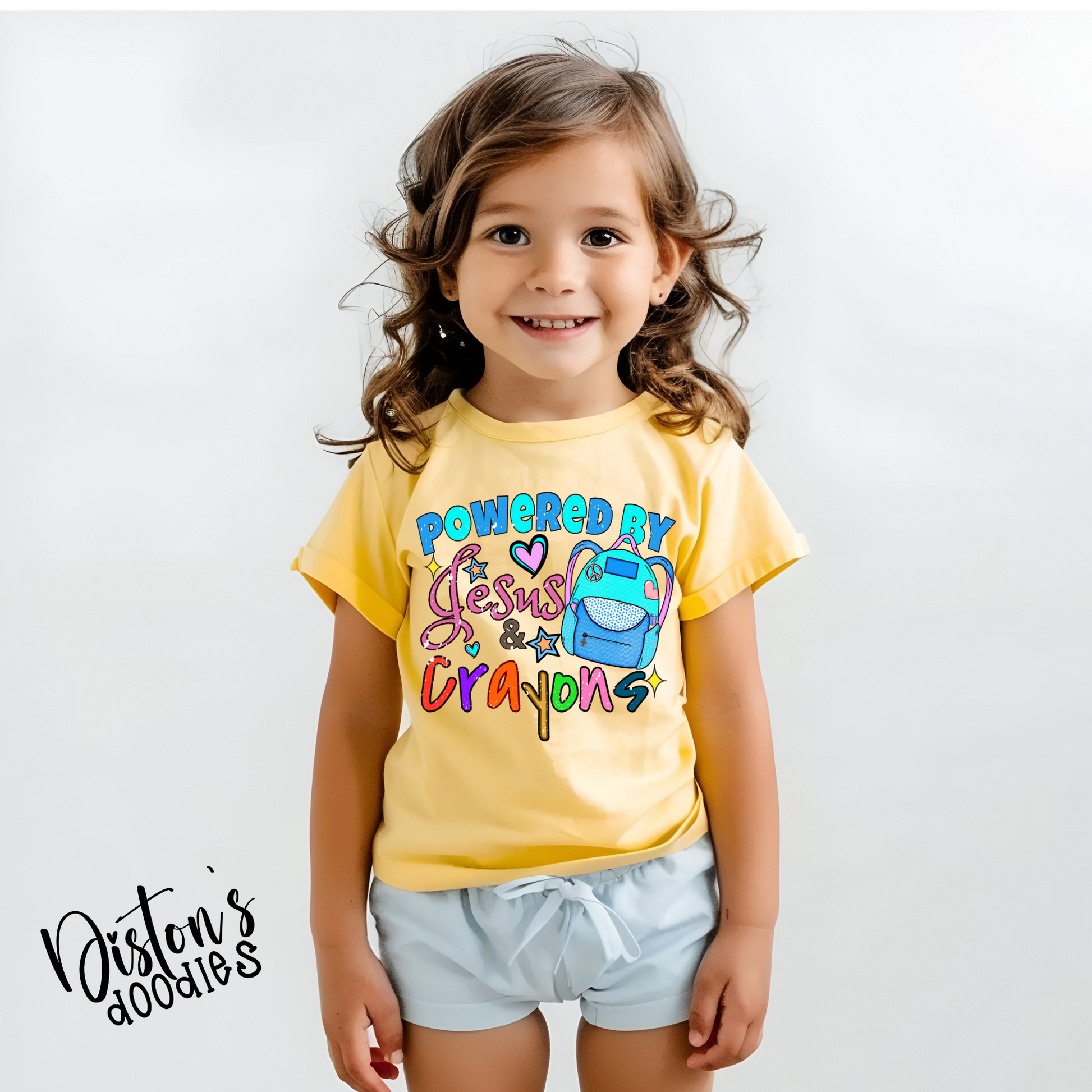 Brighten up back-to-school season with this adorable "Powered by Jesus & Crayons" digital design! Featuring playful colors, a cheerful backpack, and a heart-filled message of faith, this high-resolution PNG file is perfect for toddler and youth t-shirts.