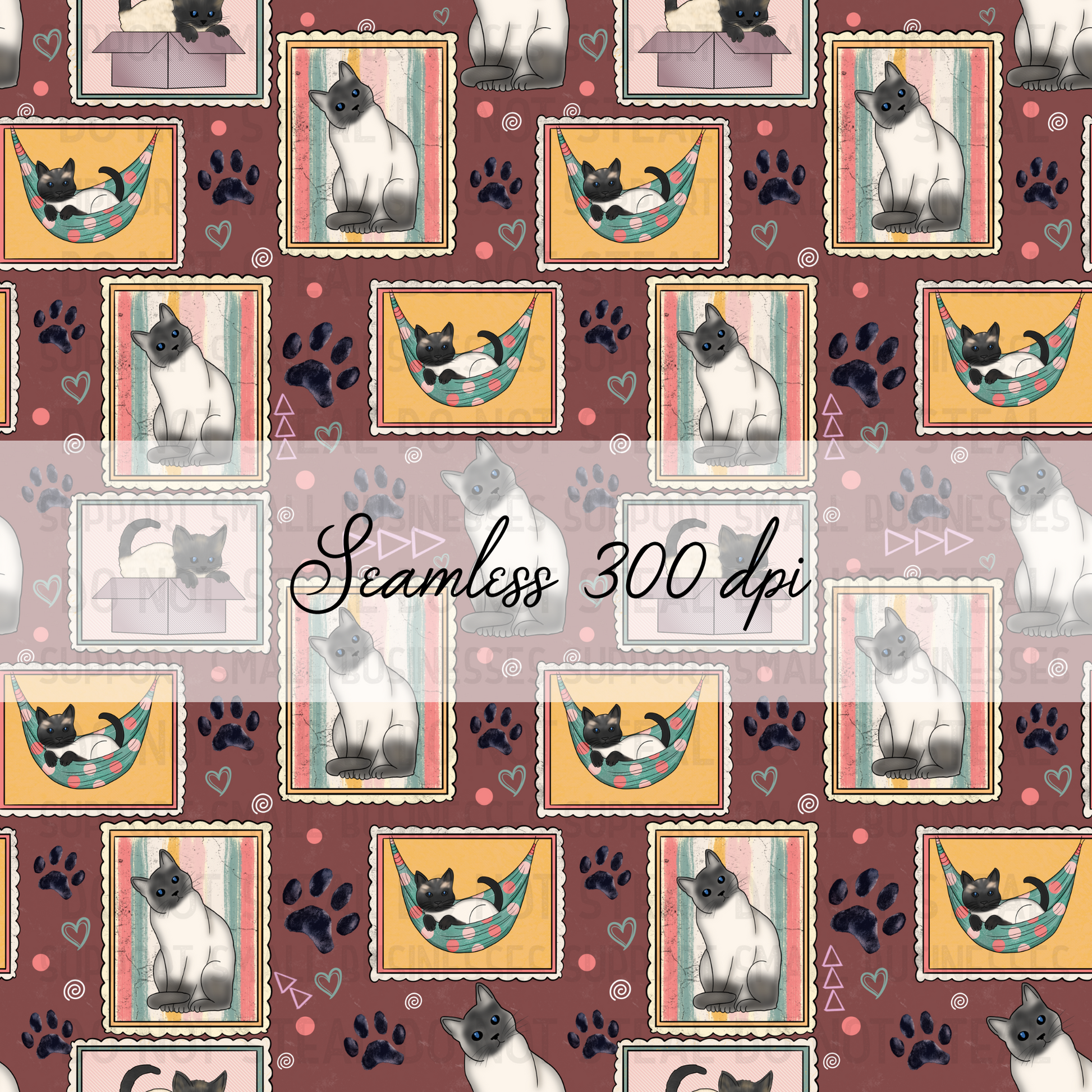 Calling all cat lovers! This adorable seamless pattern features cozy Siamese cats lounging in hammocks, sitting pretty in vintage frames, and hiding in boxes – all on a warm burgundy background with paw prints, hearts, and playful doodles.